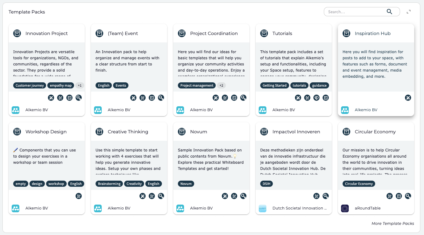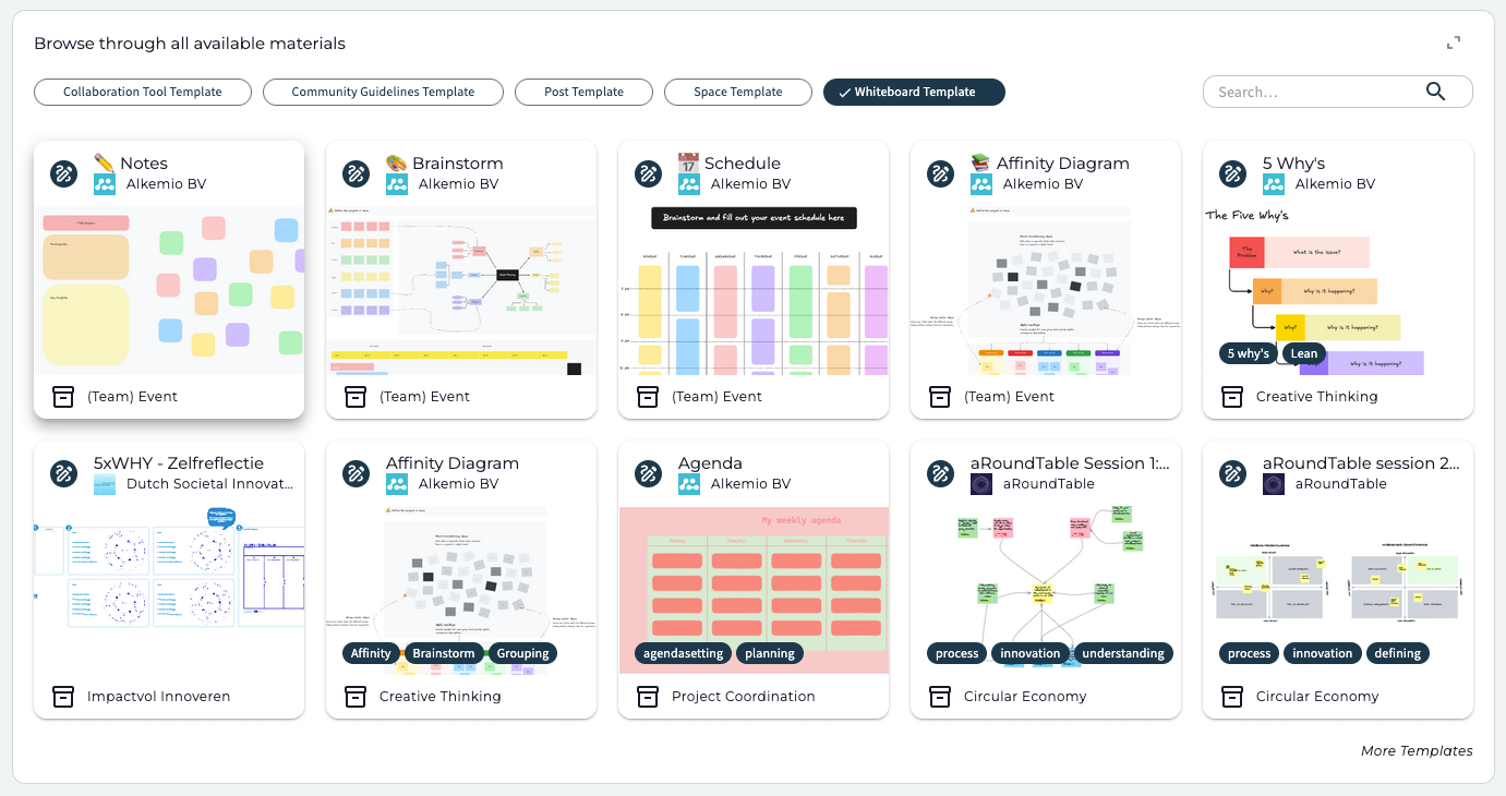 In the template library, you will also find methodologies shared by experts and content partners or developed by Alkemio. These methodologies can directly be used as instruments in your Space to facilitate (parts of) the process. They cover approaches like: